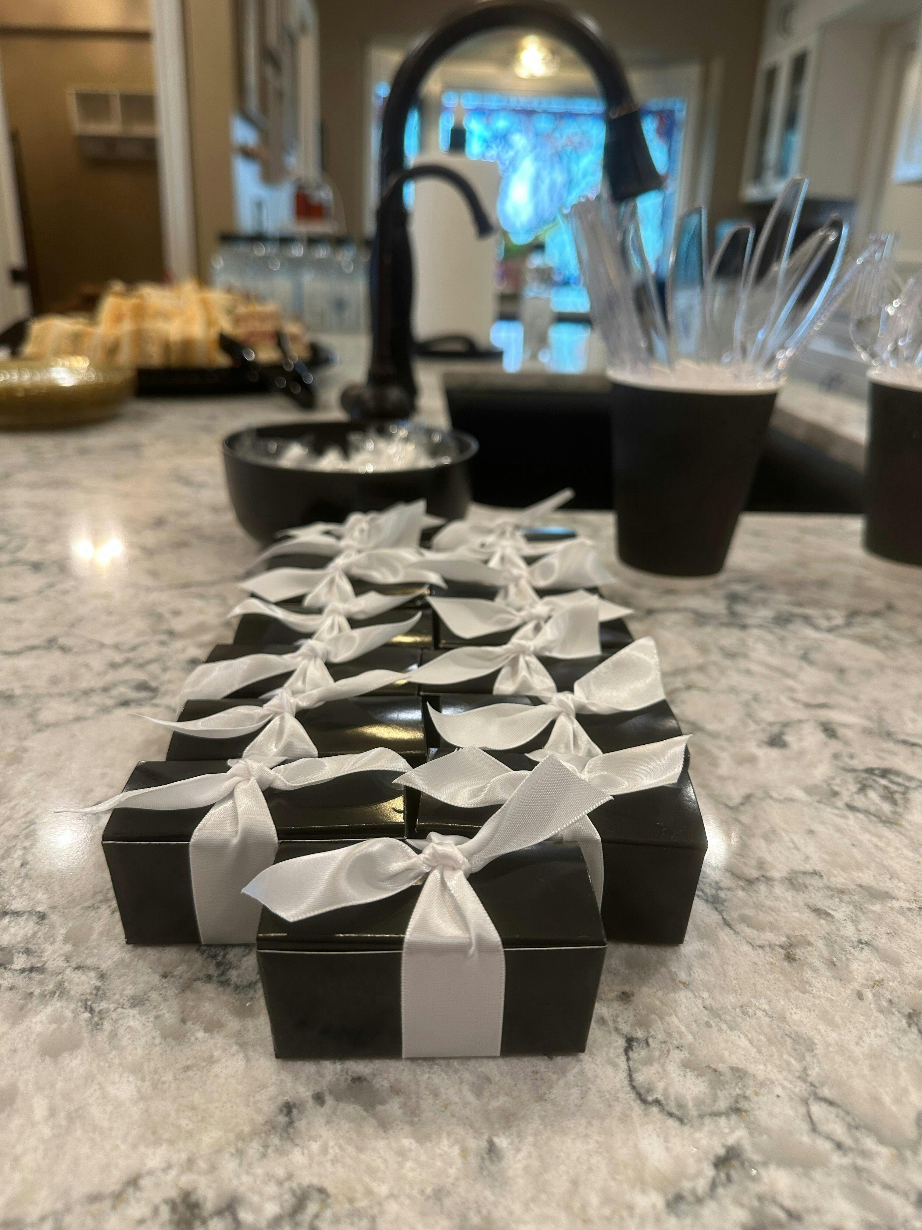 Perfect for every occasion! Choose truffles, sea-salt caramels, buckeyes or peanut butter cups to delight your guests. Or, choose our pink or blue gender-reveal truffles with delicious white chocolate centers. Top off the box with the ribbon color and bow style of your choice for a truly memorable favor.